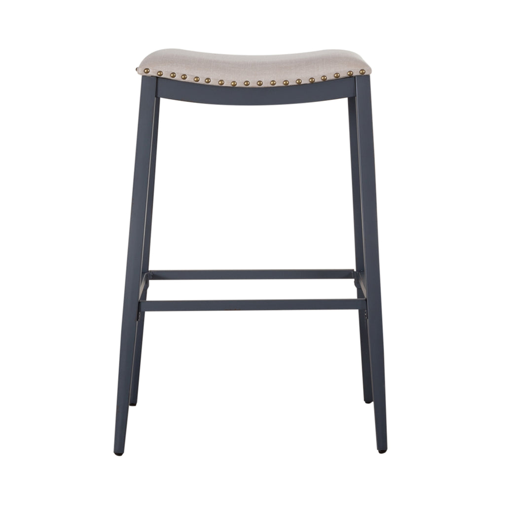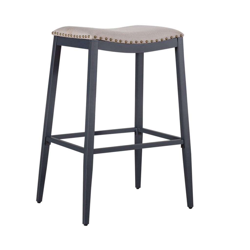 Indulge in classic vintage styling and industrial feel with the Vintage Series backless barstool. Crafted of metal, featuring nailheads with linen upholstery, this piece features multiple finish options and heavy distressing. Distressed metal finishing accompanied by colors that can mix and match offer a unique designer look.