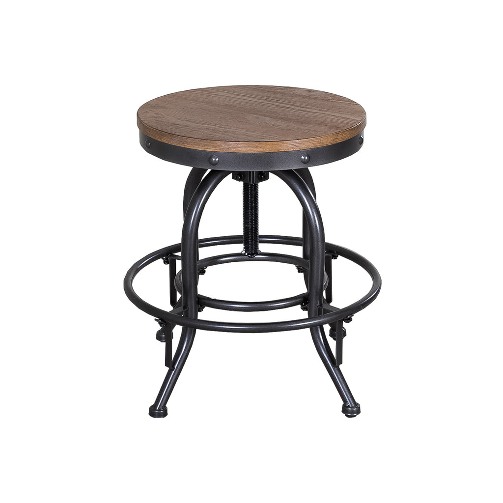 Indulge in classic vintage styling and industrial feel with the Vintage Series five-piece pub table set. Crafted of pine veneer and metal, this set includes a pub table and four adjustable counter stools. The pub table has a fixed round top in a wire brushed wood tone finish that is anchored by a distressed metal base with nail head accents. The stools offer adjustable height and match the designer look of the pub table.