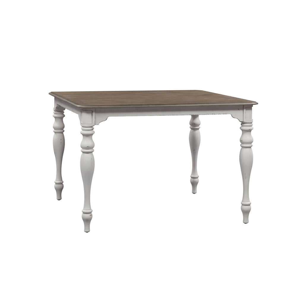 Sitting pretty with the Magnolia Manor five-piece gathering table set, consisting of four ladder back counter chairs and a gathering table. Crafted of poplar solids and white oak birch veneers, this kit features an antique white finish with a weathered brown top with whitewash. The table offers one 18-inch removeable leaf, to accommodate guests or a larger family, a fancy face dining top and heavy turned legs. The counter chairs showcase the perfect blend of European design with nylon chair glides to protect your flooring, and an arched ladder back with wooden saddle seat, anchored by beautifully turned legs. Warm antique finishes and artistic distressing along with grand scale create a piece to be passed to generations.