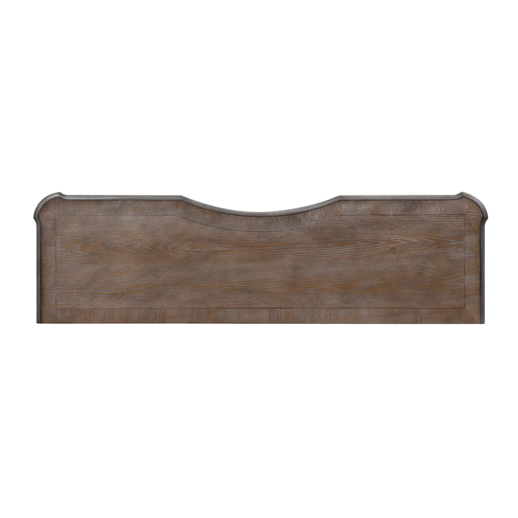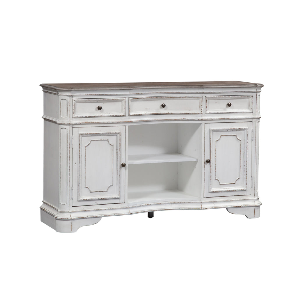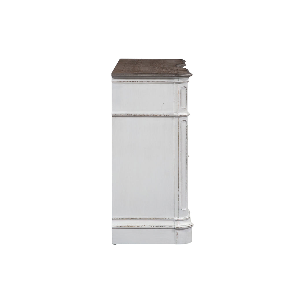 Indulge in the perfect blend of European design with the Magnolia Manor server. Crafted of poplar solids with white oak and birch veneers, this piece features fully stained full extension drawers with felt lining for easy access to storage, a centered concave top drawer flanked by two storage drawers and doors, a convenient center shelf for added storage, and is accented by antique pewter knob hardware. Storage abounds with an adjustable shelf located behind the two doors, the center open area with an adjustable shelf, and the wood framed drawers. The attention to detail is impeccable with the weathered brown finish accented by whitewash, the canted corners, rounded pilasters, and bead molding anchored down by the bracket feet. Warm antique finishes and artistic distressing along with grand scale a group to be passed to generations.