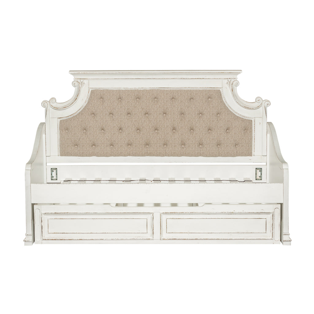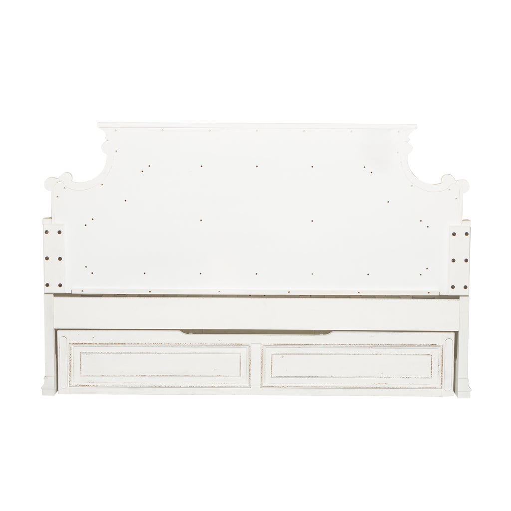 Add an extra bed or storage without taking up any additional room with the Magnolia Manor trundle. Finished in an antique white finish with heavy chipping this piece is crafted of poplar solids and white oak and birch veneers. The trundle features bead molding accents for a decorative appeal and easily stores underneath the daybed when not in use. Use a twin size mattress or opt for storage with a finished interior and three separate compartments perfect for clothing or blankets. Features casters for ease of movement.