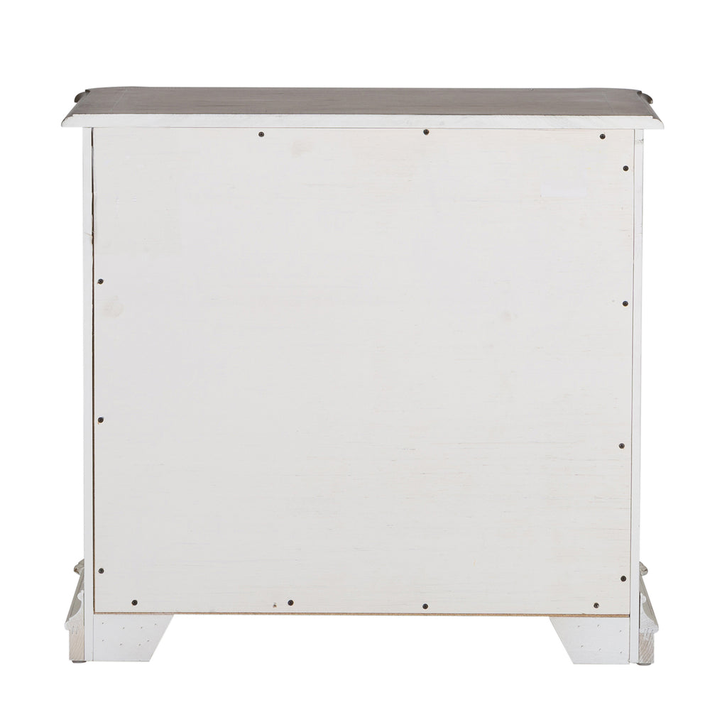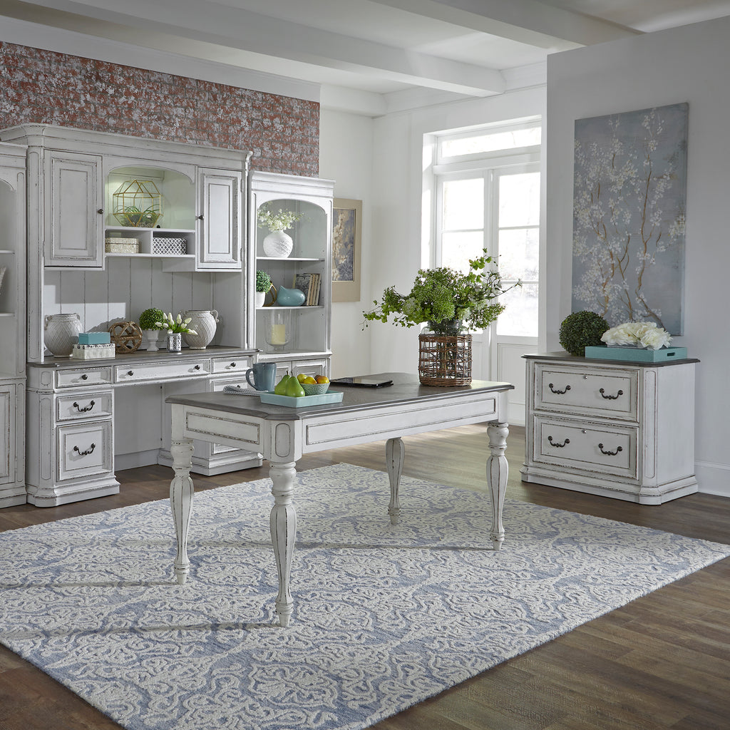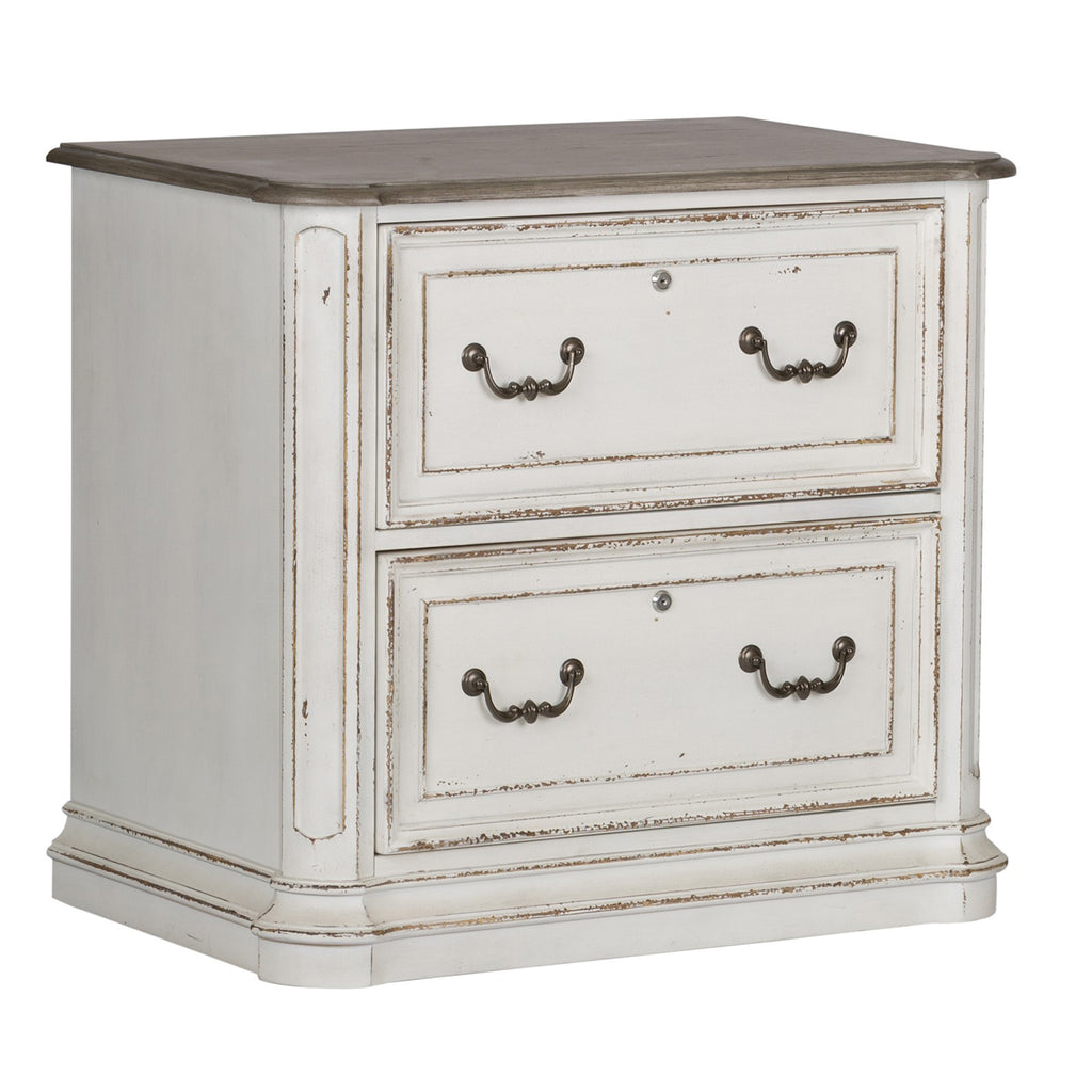 Indulge in the perfect blend of European design with the Magnolia Manor Jr executive media lateral file. Crafted of poplar solids with white oak and birch veneers, this piece features canted corners and two fully stained full extension drawers with a lock system keeping valuables secured, wood framed drawer fronts, bead molding, and is accented by bail pull hardware in an antiqued pewter. The top is finished in a weathered brown with whitewash and has rounded pilasters. Warm antique finishes and artistic distressing along with grand scale create a piece to be passed to generations.