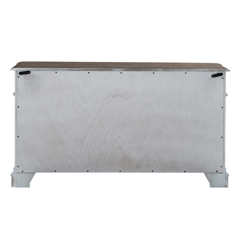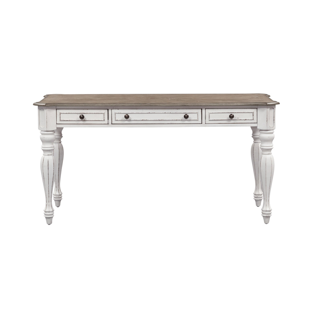Indulge in the perfect blend of European design with the Magnolia Manor 3-piece desk and hutch set. Crafted of poplar solids with white oak and birch veneers, this set features full extension metal drawer glides, hutch features arched crown molding, dog bone accents, bead molding, planked back panel, two wood framed glass adjustable shelves, and is accented by bail pull and knob hardware in an antique pewter. Writing desk features a flip down keyboard tray and bead molding. Tops of writing desk and credenza are finished in a weathered brown with whitewash and the desk top has a fancy face veneer grain direction. This set includes a writing desk, credenza, and credenza hutch. With today's modern technology in mind, users can enjoy the added convenience of the built-in wire management provisions, making working from home a breeze. Warm antique finishes and artistic distressing along with grand scale create a piece to be passed to generations.