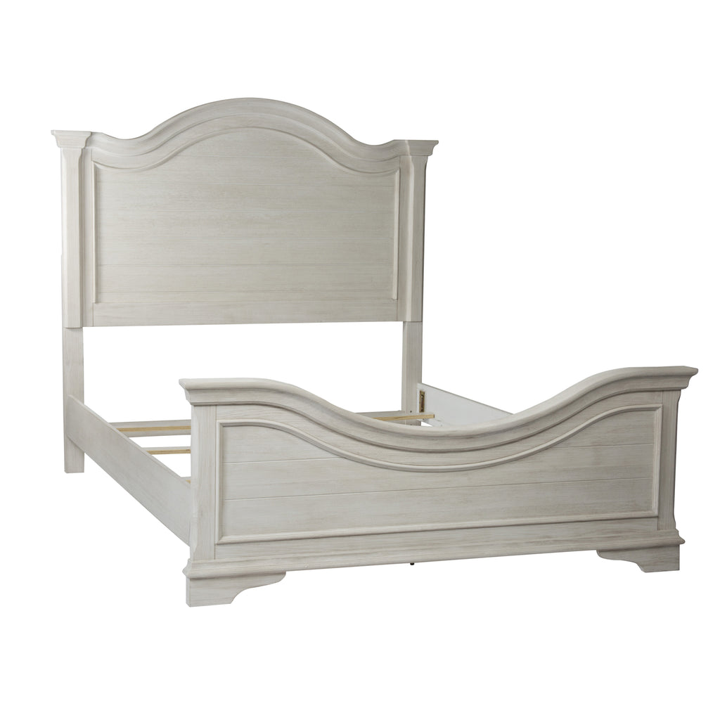 Enhance your room with this timeless Bayside king panel bed, dresser and mirror, chest, and nightstand kit, creating a shabby chic interior that all homeowners love. Crafted of pine solids and acacia veneers, this kit is unique with its antique white finish accented by heavy wire brushing. The bed features chamfered posts, an arched cap rail, planed panels offering dimension, bolt on rail system and center supported slat system, ensuring reliability and longevity. The dresser, chest, and night stand feature full extension drawer glides for easy access to storage, fully stained interior drawers, bead molding, chamfered pilasters, wood framed drawer fronts, bracket feet, and is accented by antique pewter bail hardware. The mirror is elegantly arched with beveled glass, creating dimension.