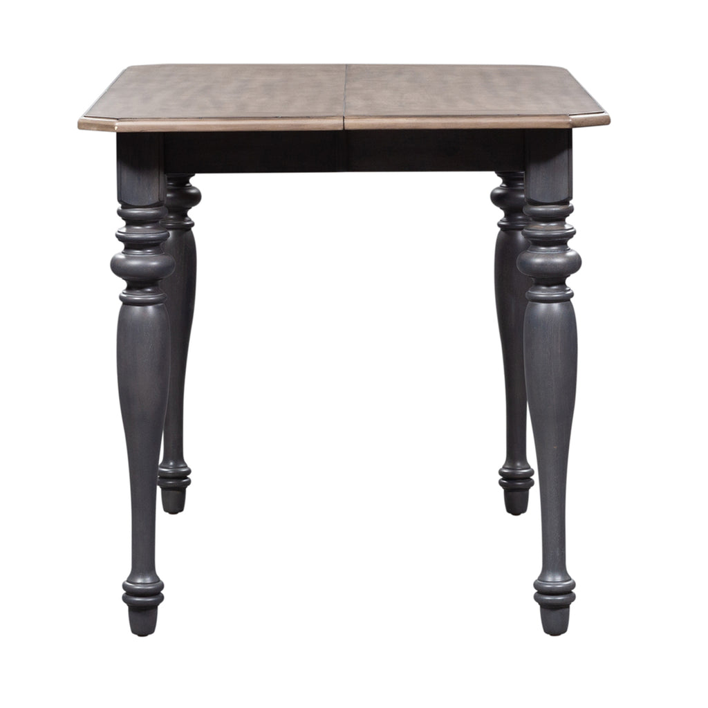 Gather around the Ocean Isle gathering table. Crafted of rubberwood solids with pine veneers, this piece features a slate finish with weathered pine, one 18-inch removable leaf, canted corners, pine veneer top, a two-toned finish and is anchored by heavily turned legs. This piece is available in alternate finishes, sure to be a great addition to any home. Elegantly styled and casually proportioned, this table works in a dining room or kitchen dining combination effortlessly.