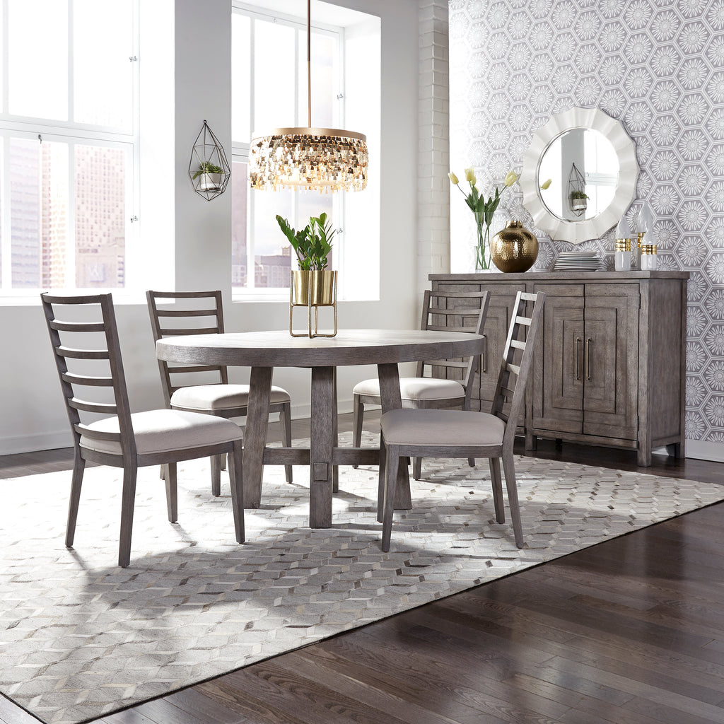 Wow family and friends with the Modern Farmhouse five-piece round dining table set. Crafted of poplar solids with knotty white oak veneers, this set features a dusty charcoal finish with heavy distressing and wire brushing and consists of the round dining table and four ladderback side chairs. The table has a thick planked top with an included 12” removable leaf, anchored by block splayed legs with an X stretcher for secure stability. The chairs have Dakota linen fabric upholstery on the seat and shaped back slats for comfort. Nylon chair glides are added to protect your flooring. The Modern Farmhouse collection features simple clean lines that will create a timeless style, giving you the ability to mix new and older pieces together with a layering effect.