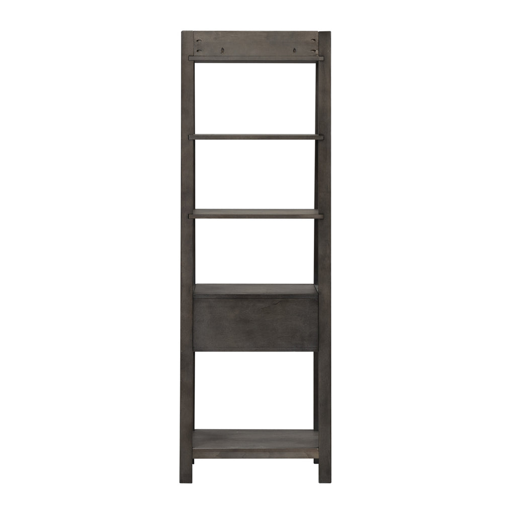 Maximize storage and convenience with the Modern Farmhouse 72" leaning bookcase. Crafted with poplar solids and knotty white oak veneers, this piece features a dusty charcoal finish with heavy distressing, a fully stained full extension storage drawer, and lots of shelf space. This piece is available in an alternate finish, sure to be a great addition to any home. Users have the option to pair with the credenza, or use as a single bookshelf, as this piece can stand alone.