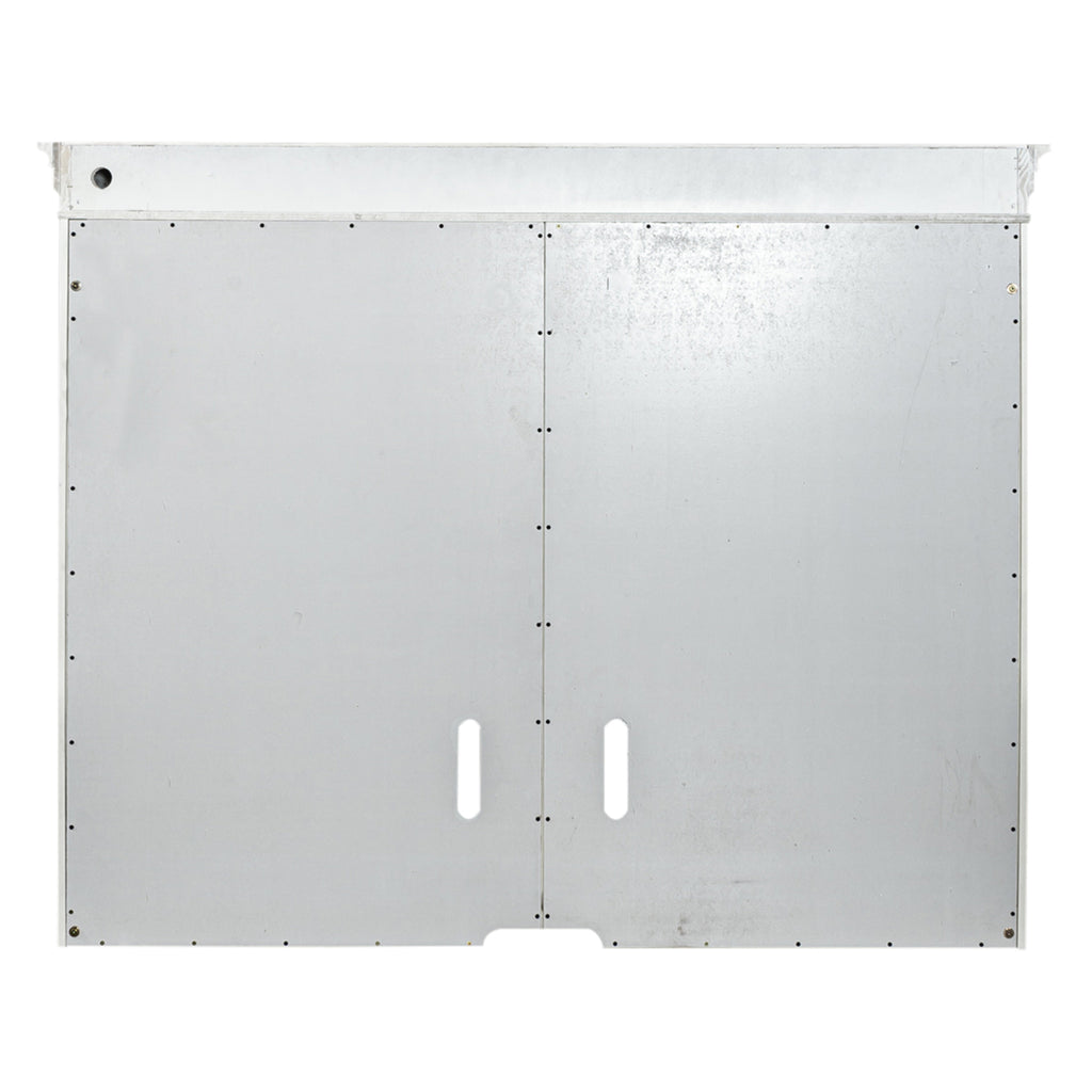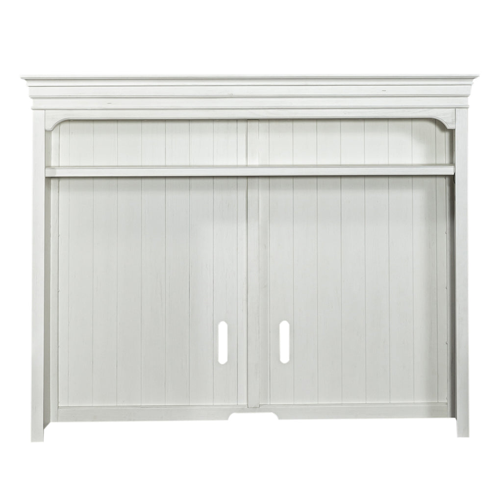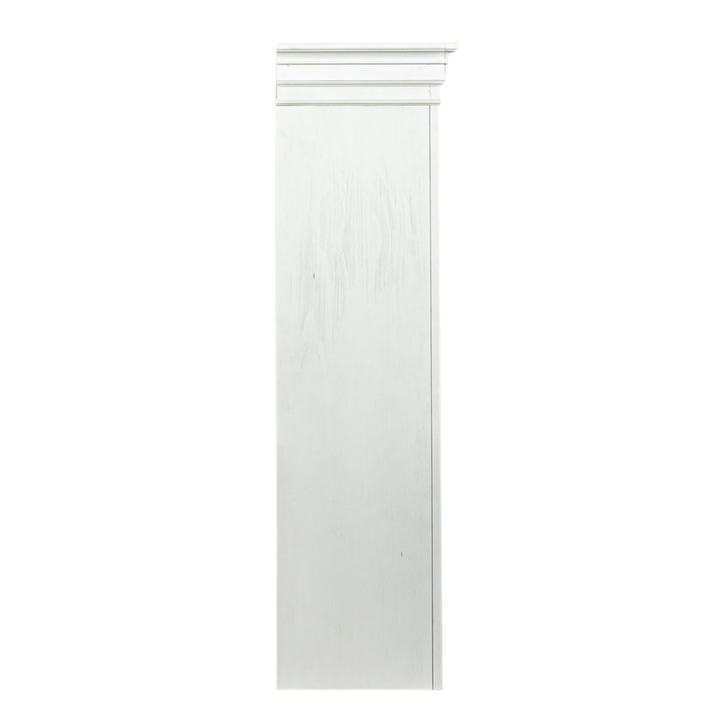 Crafted of poplar solids and white oak veneers in a Wirebrushed white finish. Features LED touch lighting, heavy top crown molding, adjustable top shelf, and wire management provisions to conceal wiring. Pair with the left pier base, left pier top, right pier base, right pier top and 72” TV console to make a complete wall.