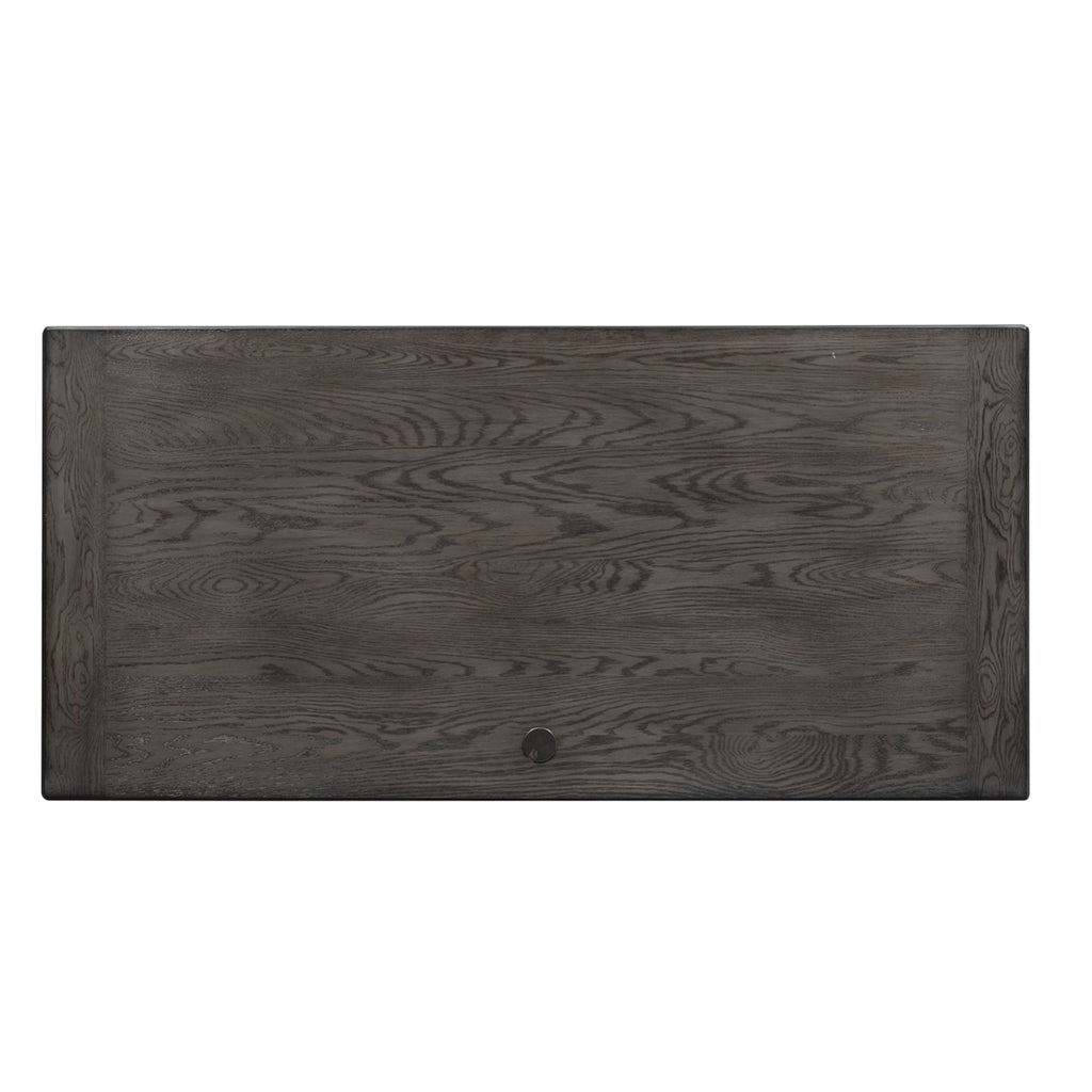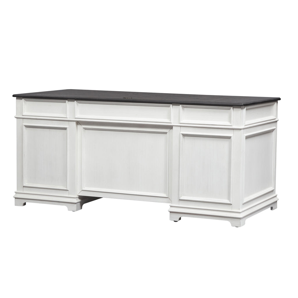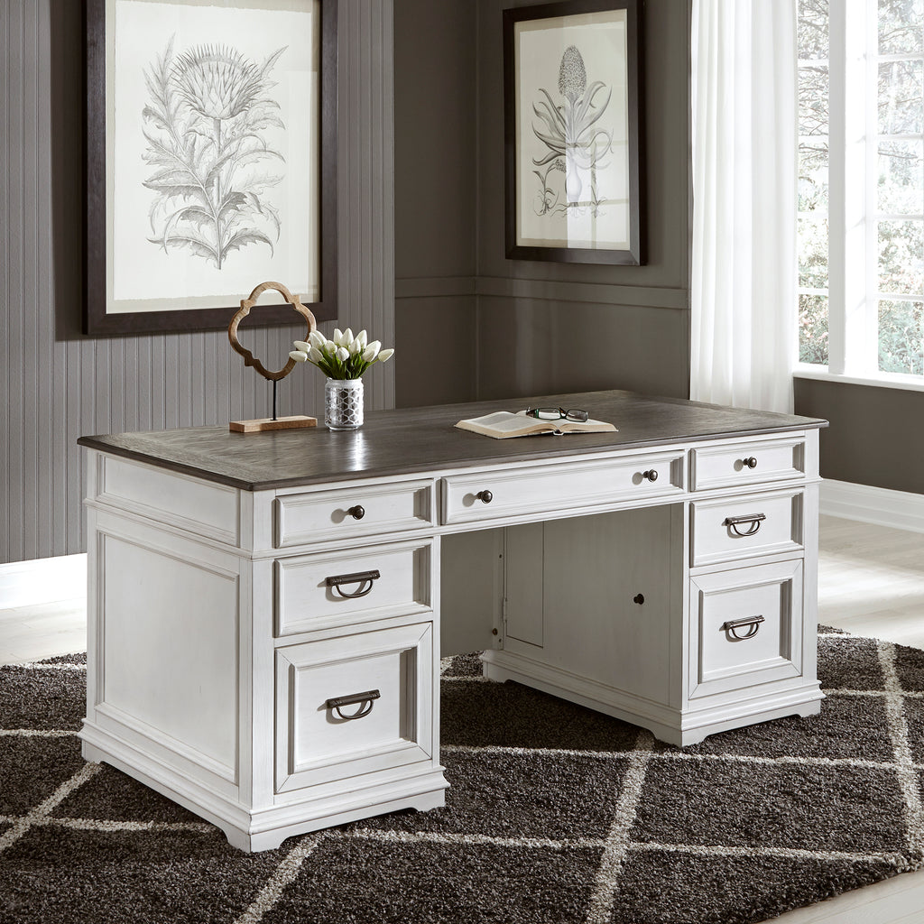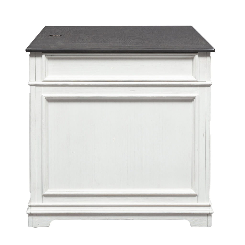 Work from home in comfort and style with this aged cottage Allyson Park Desk. This two-toned piece consists of planked wire brushed charcoal tops, anchored by a solid white base. The desk comes equipped with 2 locking file drawers, flip down keyboard tray and a wire management cut out on the desk top, for user convenience.