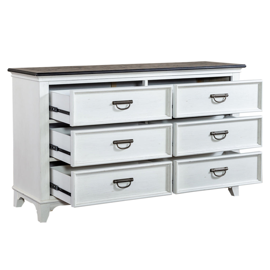 Create a classic cottage style with 6 drawer dresser. The two-toned wire brushed white finish with charcoal top adds a taste of vintage, allowing this piece to work from the mountains to an industrial loft. The charcoal top is accented by planks while the white base is highlighted by bead molding and antique pewter hardware. Crafted of rubberwood solids with cathedral white oak tops, this piece features fully stained interior drawers, full extension drawer glides for easy access to storage, felt lined top drawers, and is anchored by tapered feet. Style uncompromised with storage abound, enjoy the ample drawer storage, each equipped with bottom case dust proofing.