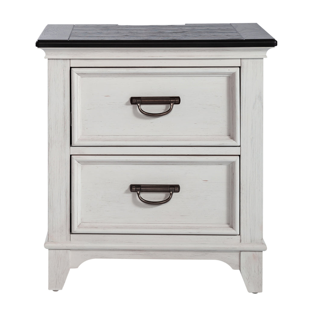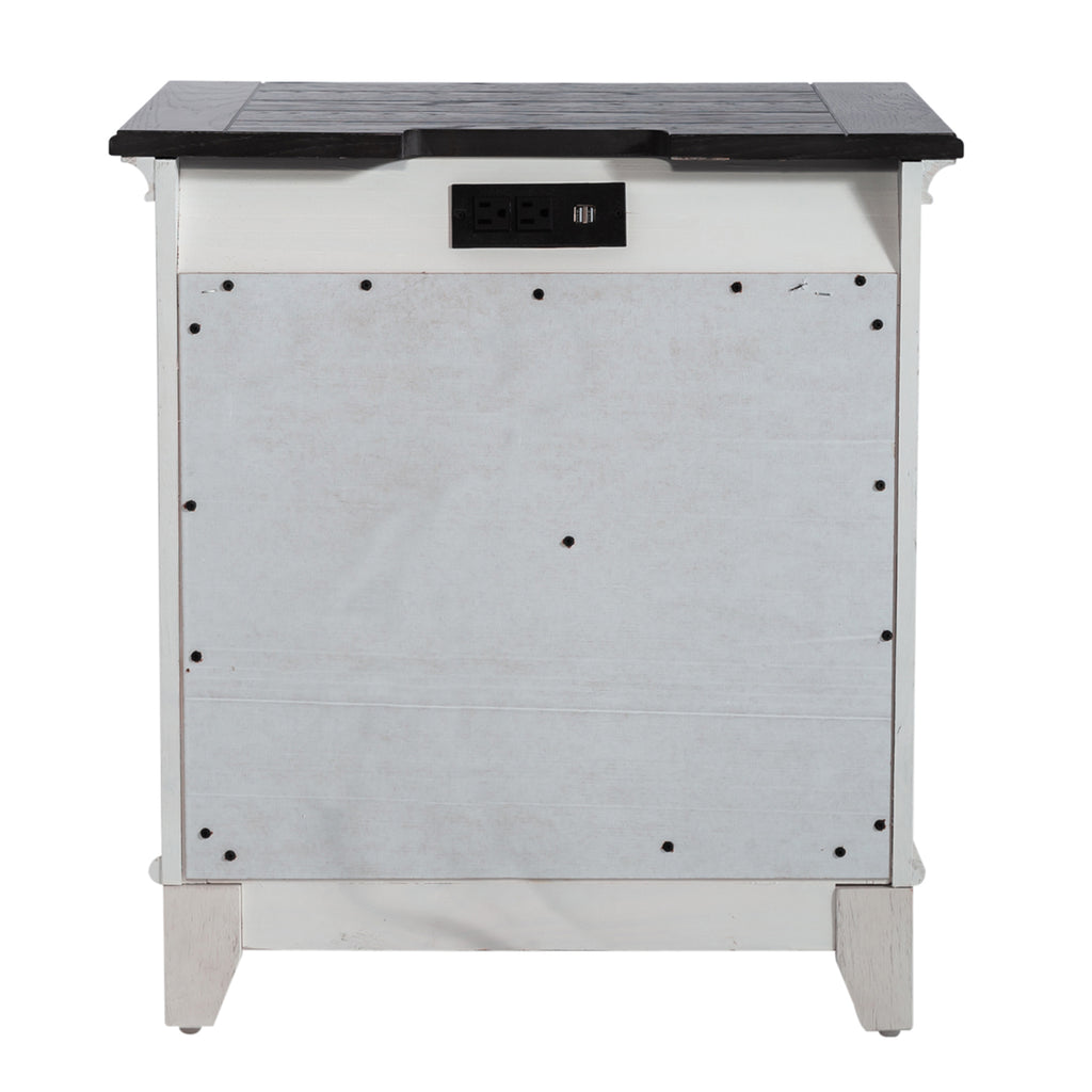 Create a classic look with a casual feel using this 2 drawer night stand. The two-toned wire brushed white finish with charcoal tops creates a cottage style that works anywhere from the beach to the mountains. Crafted of poplar and rubberwood solids with cathedral white oak tops, this piece features fully stained interior drawers, full extension drawer glides for easy access to storage, and bottom case dust proofing to preserve contents. Planked tops add a vintage vibe while the stylish tapered feet tie in to the cottage design. With today's technology in mind, users can enjoy the benefit of the incorporated charging station, featuring two USB ports and two outlets, making multi-device charging a breeze.
