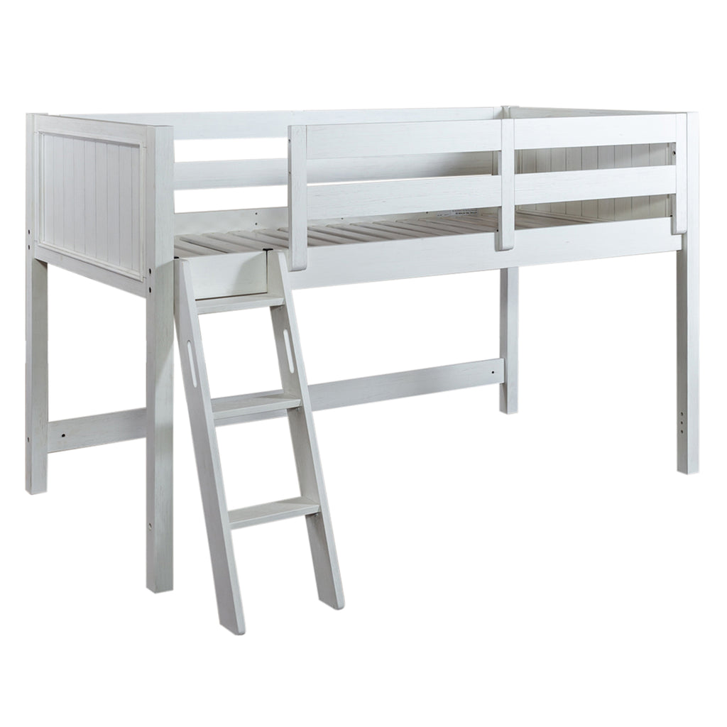 Create a classic look with a casual feel using the Allyson Park twin loft bed. The wire brushed white finish creates a cottage style that works anywhere from the beach to the mountains. Crafted of pine solids this piece features functional storage with a removeable dresser and bookshelf to maximize playroom space, a sliding door, 3 drawers, adjustable shelving, planked design on the headboard and footboard, antique pewter drop bail hardware, and additional storage, provided by the attached bookcase with adjustable shelving.