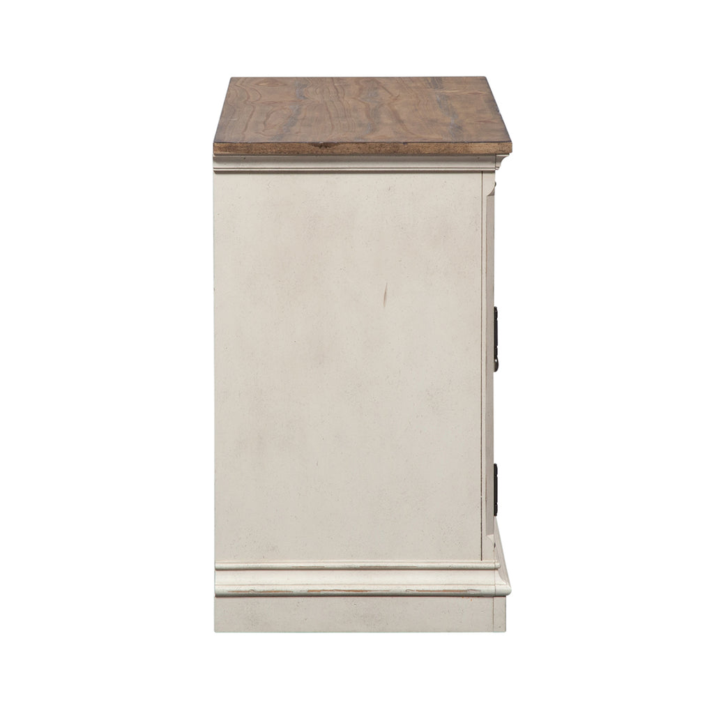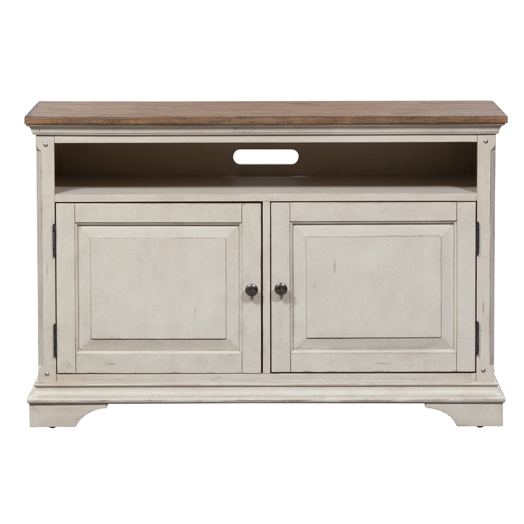 Combine traditional living and todays modern lifestyle effortlessly with the Morgan Creek 46" TV console. Crafted with polar solids with pine and rustic birch veneers, this piece accommodates most 50" TVs and features a two-tone antique white and w/ wire brushed tobacco tops, wood framed raised panel doors, decorative nail head trim, two storage drawers, and one adjustable shelf behind each door. The open compartment and wire management provisions effortlessly accommodate electronics or gaming equipment. The warm antique finishes and artistic distressing along with grand scale, makes this a piece to passed on to generations.