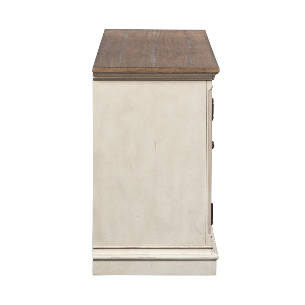 Combine traditional living and todays modern lifestyle effortlessly with the Morgan Creek 66" TV console. Crafted with polar solids with pine and rustic birch veneers, this piece accommodates most 72" TVs and features a two-tone antique white and w/ wire brushed tobacco tops, wood framed raised panel doors, decorative nail head trim, two storage drawers, full extension drawer glides for easy access to storage, and one adjustable shelf behind each door. The open compartment and wire management provisions effortlessly accommodate electronics or gaming equipment. The warm antique finishes and artistic distressing along with grand scale, makes this a piece to passed on to generations.