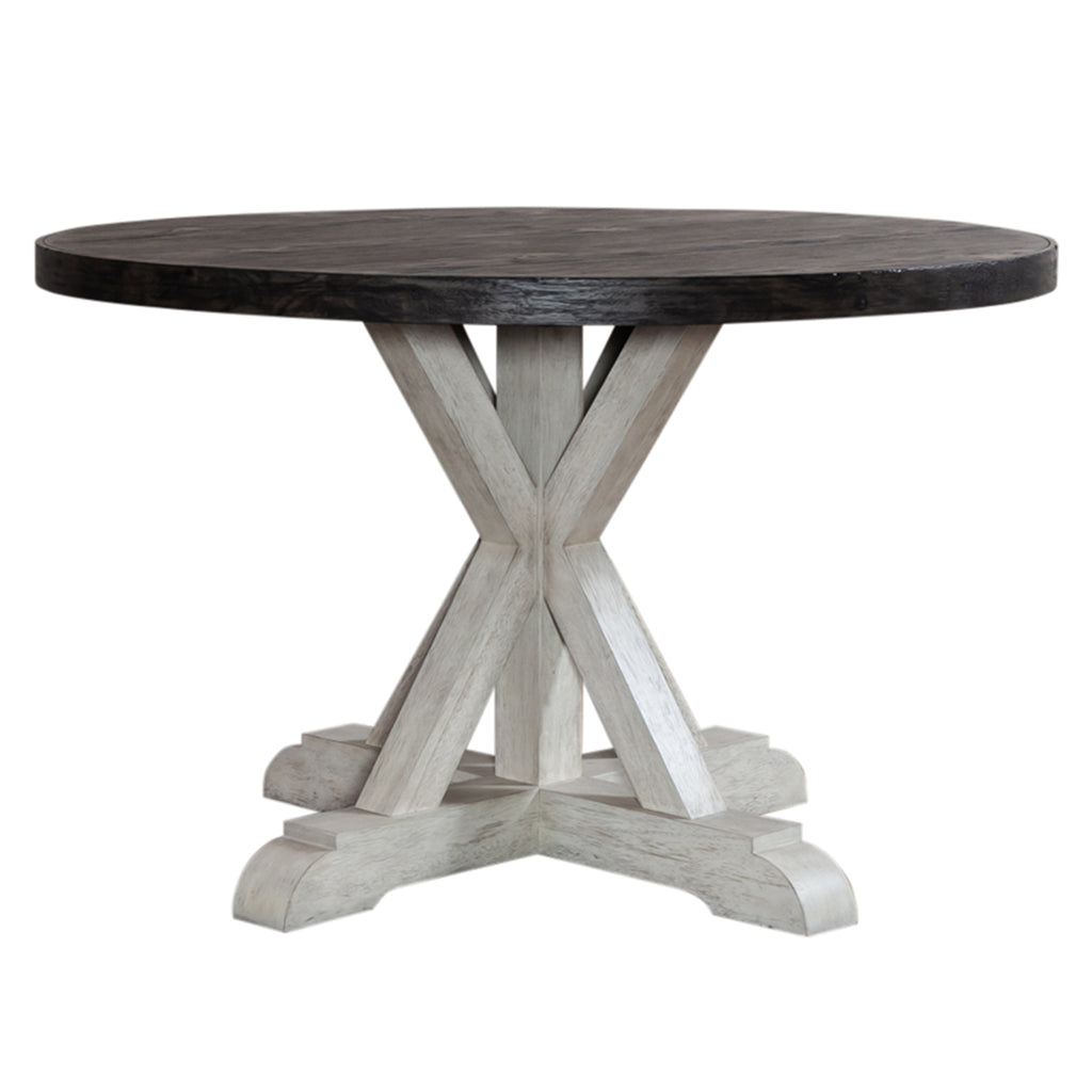 Warm and cozy. Bring beauty indoors with the Willowrun pedestal table. Crafted of rubberwood solids with acacia and pine veneers, this set features a rustic white finish with wire brush distressing and a weathered gray top. The pedestal table and a fixed round top that is anchored by an architectural style X base. Willowrun offers a relaxed style, creating a classic look with a casual feel.