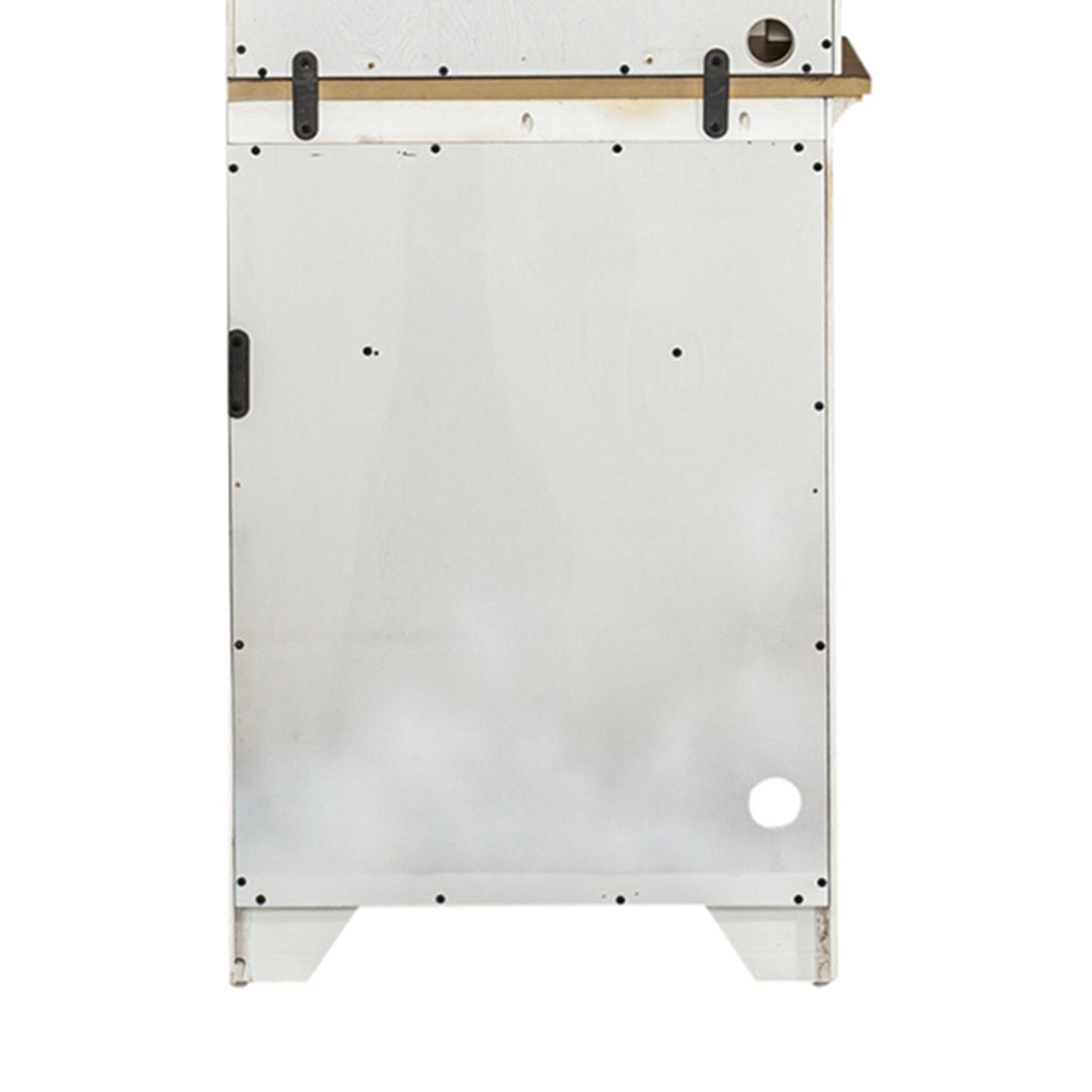 Maximize storage and convenience with the Farmhouse Reimagined left pier base. Crafted with pine solids with hickory and pine veneers, this piece features an antique white finish with chestnut tops, a fully stained interior drawer, and heavy crown molding accented by antiqued brass knob hardware. A fixed shelf is located beneath the drawer and is accented by the contrasting planked back panel, finished in chestnut. Pair this piece with the left pier top, right pier unit, entertainment hutch, and 72" tv stand to complete the set, as this piece cannot stand alone.