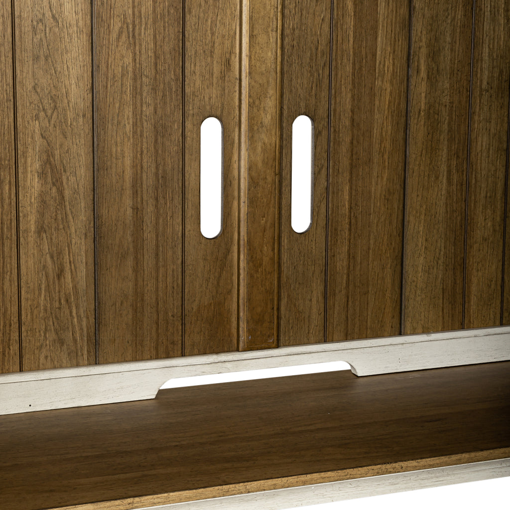 This unique entertainment center with piers is the perfect way to accent your room with a simple yet bold cottage style. Crafted with pine solids and hickory and pine veneers, this piece features an antique finish accompanied by heavy distressing, fully stained interior drawers, adjustable shelving, and touch lighting on the piers. The open components and wire management provisions effortlessly accommodate a DVD player or gaming console of choice.