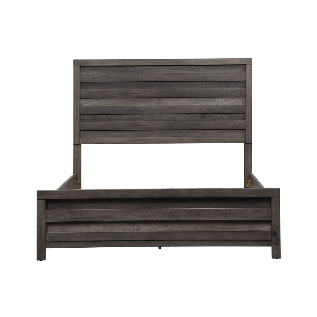 Move away from the traditional and bring in a clean and simple look with the Tanners Creek king panel bed, dresser, mirror, and chest. Crafted of melamine and rubberwood solids, this kit features a Greystone finish, laminate drawer interiors, solid wood picture frame fronts, a high-low effect created by solid wood strip onlays, and is accented with dark antique brass finger pull hardware. The panel bed features hook-on rails and a sturdy center support slat system. The dresser has six drawers and pairs beautifully with the beveled edge mirror that is anchored by bolt-on supports. The chest adds an additional five drawers of storage. Create a natural feeling in your home with the Tanners Creek bedroom collection.