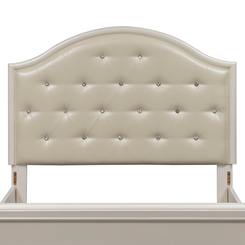 Features an upholstered arched panel tufted with crystal buttons in a iridescent white vinyl. Headboard can stand alone with Hollywood frame. Pair with the footboard and rails for a complete bed.