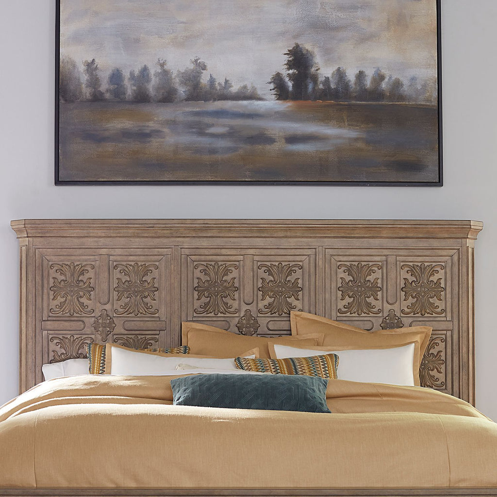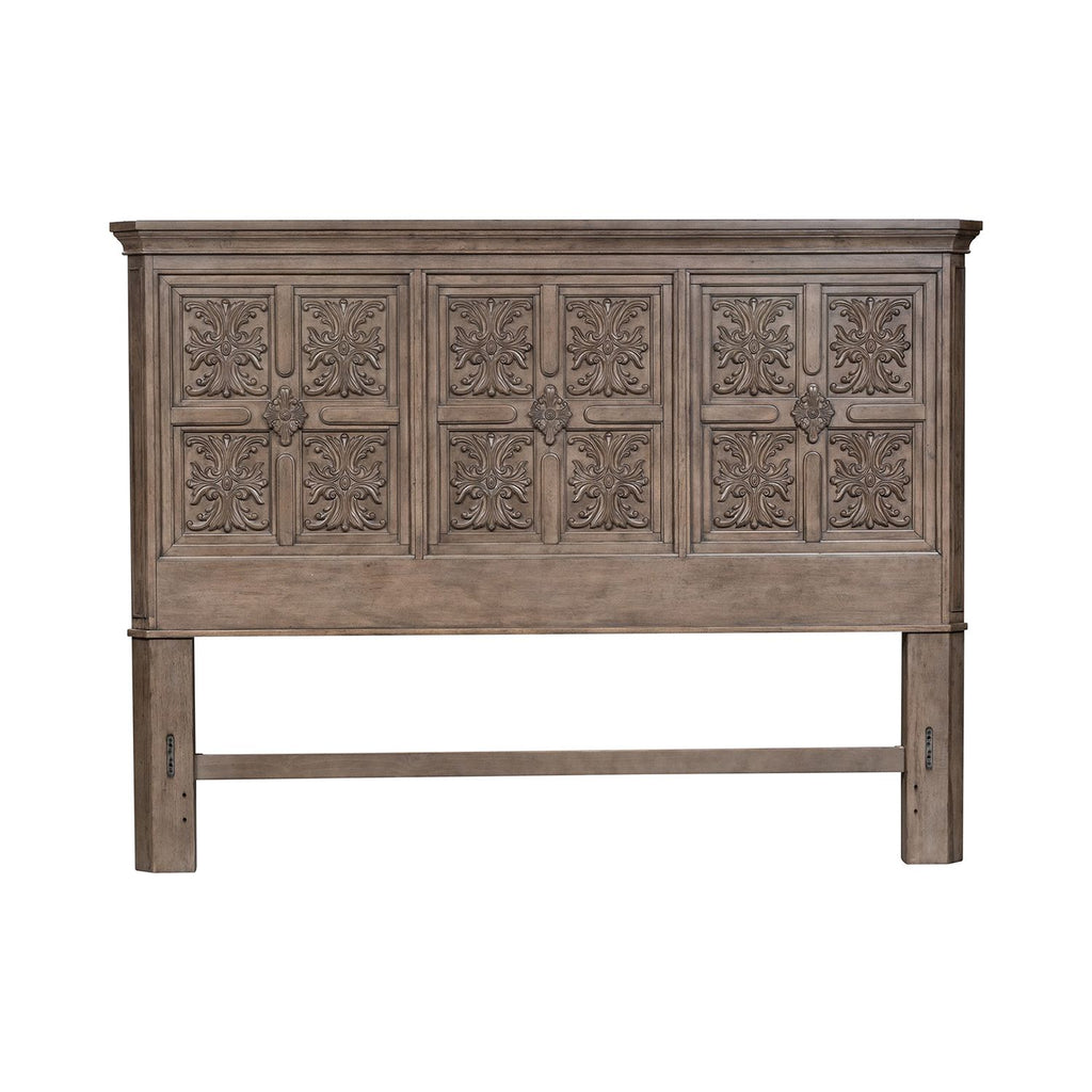 Combine a feel of the past with today's luxurious lifestyle with The Laurels panel bed. Crafted by rubberwood solids with rustic birch veneers, the weathered stone finish creates a worn antique feel with artistic distressing that captures the essence of the Traditional European design. The headboard features beautiful Fleur De Lis carvings, surrounded by heavy moldings and canted corners that create an architectural appeal. Never question the reliability of the bed thanks to the bolt-on rails and center supported slat system.