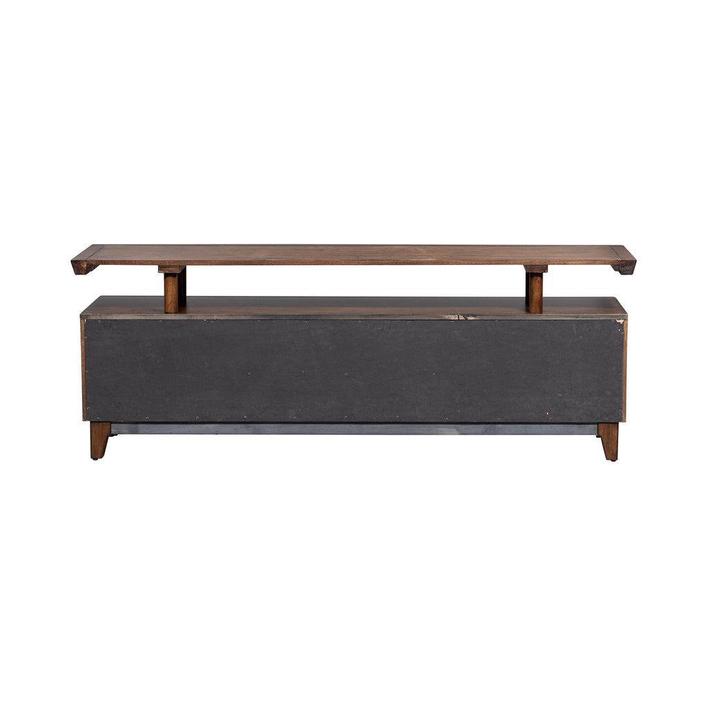 Combine mid century and modern styles to create the Venture Blvd 72" tv console. Crafted with rubberwood solids with cathedral walnut veneers, this piece accommodates most 75" TVs and features a bronzed spice finish with wire brushed drawer fronts, full extension drawer glides for easy access to storage, a modernized floating top design, and angled apron on console top, contemporary, clean lines, anchored by tapered splayed legs. The open components effortlessly accommodate electronics or gaming equipment.