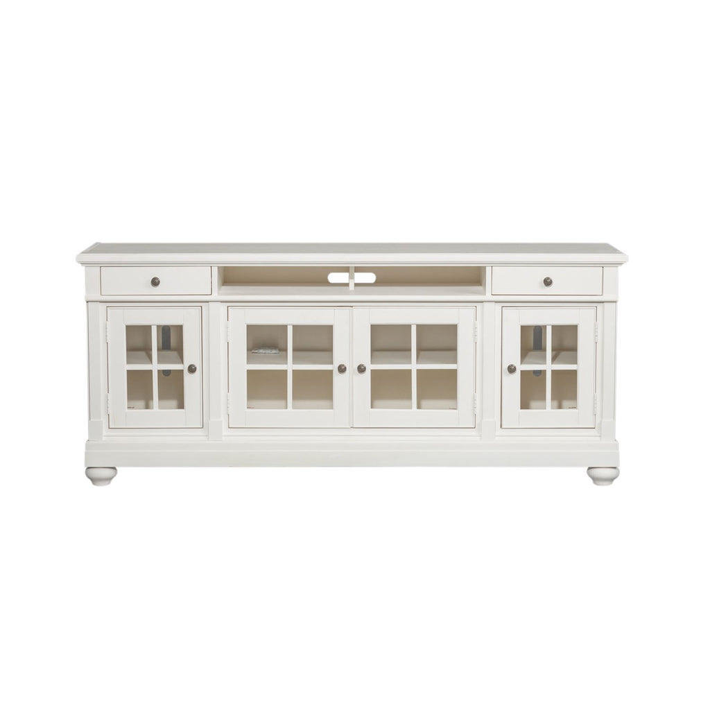 Indulge in a casual cottage style with the Harbor View 62" tv stand. Crafted with poplar solids and okume veneers, this piece comes in two sizes, can accommodate most 68" TVs and features wood framed tempered glass doors with grid overlay, fully stained interior drawers, a linen finish, antique pewter knob hardware, and is anchored by bun feet. The open components and wire management provisions effortlessly accommodate a DVD player or gaming console of choice.