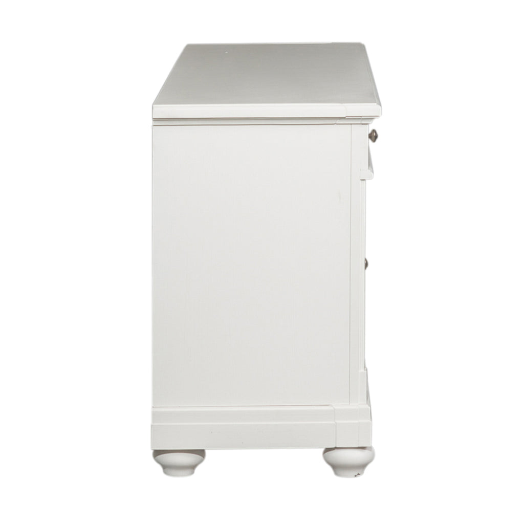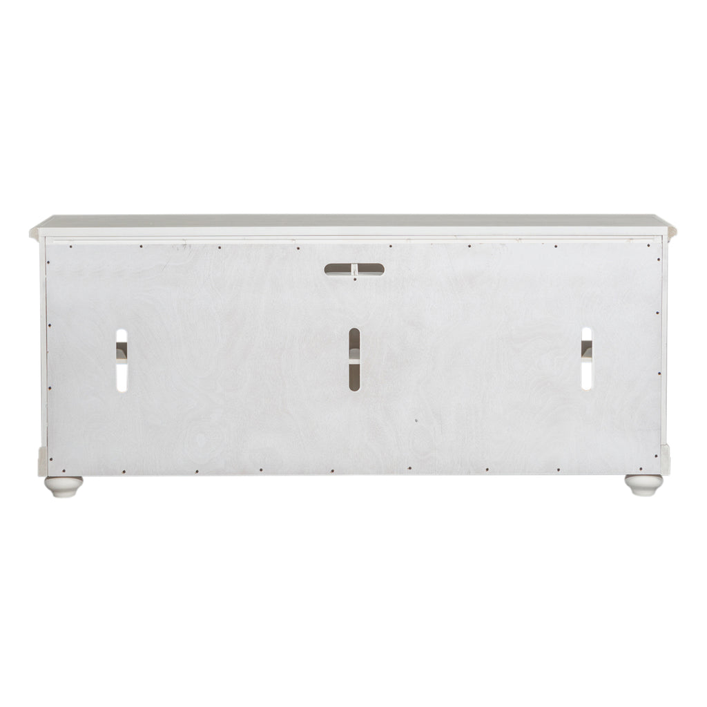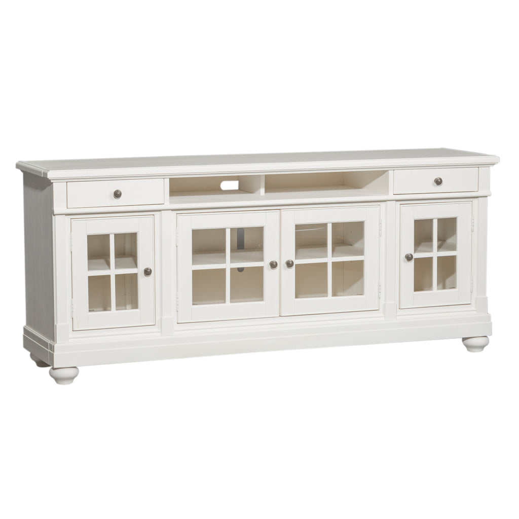 Indulge in a casual cottage style with the Harbor View 74" tv stand. Crafted with poplar solids and okume veneers, this piece comes in two sizes, can accommodate most 82" TVs and features wood framed tempered glass doors with grid overlay, fully stained interior drawers, a linen finish, antique pewter knob hardware, and is anchored by bun feet. The open components and wire management provisions effortlessly accommodate a DVD player or gaming console of choice.