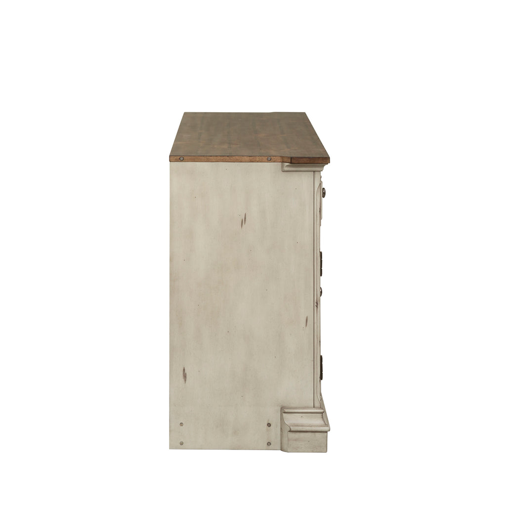 Combine traditional living and todays modern lifestyle effortlessly with the Morgan Creek 68" tv stand. Crafted with polar solids with pine and birch veneers, this piece can accommodate most 76" TVs and features an antiqued white base with brushed tobacco tops and heavy distressing, wood framed glass doors that allow for remotes to work through the glass, removeable side molding that allow this piece to stand alone, adjustable shelving, and is anchored by bracket feet. Wire management provisions effortlessly accommodates a DVD player or gaming console of choice. The warm antique finishes and artistic distressing along with grand scale, makes this a piece to be passed on to generations.