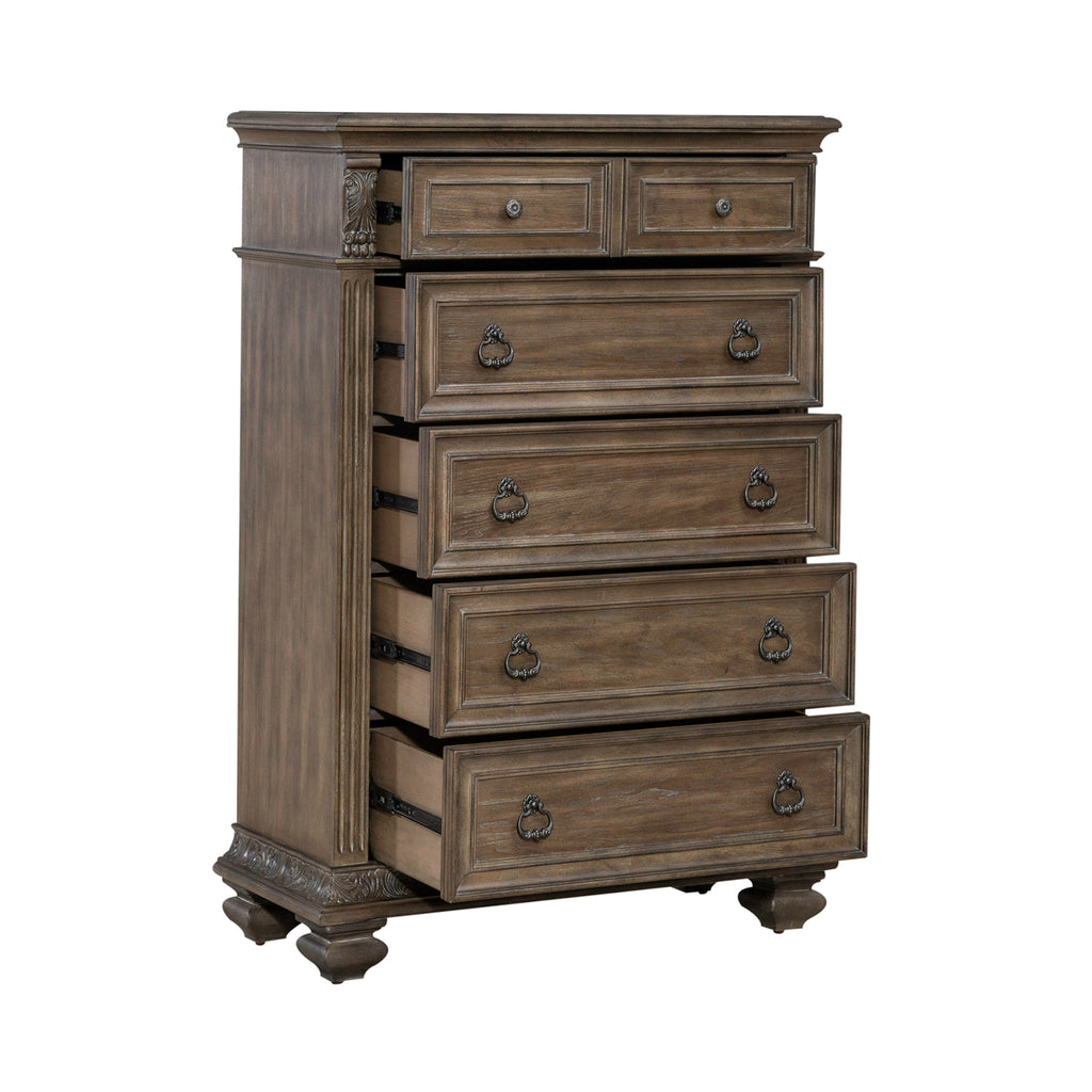 Indulge in luxury with the Carlisle Court five drawer chest. Crafted with excellence using rubberwood solids and rustic hickory veneers, this chest features a Chestnut with Gray Dusty Wax finish. The chest has carved corbels that accent fluted pilasters. The base showcases acanthus leaf carvings and square turned bun feet. There are five full extension drawers for optimal storage. The top drawer has a bluff-cut drawer front giving the illusion of multiple smaller drawers while still offering deep storage. The drawer fronts are wood framed and feature bead molding for added dimension and are accented with Antique Brass knob and drop ring hardware. The top drawer is felt lined, and the bottom drawer is lined with cedar. Combine the grand feel of the past with today’s luxurious lifestyle with the Carlisle Court five drawer chest.