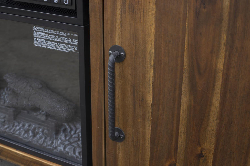 Hand-crafted and finished in a multi-toned wood pattern, the Northwood Fireplace Cabinet brings warmth and functionality to any room in your home! On top are three open storage shelves for your media components and two cabinets on either side of the fireplace offer more roomy storage space. The fireplace is electric with easy to use remote control for flame and heat control as well as a timer and auto shut off for safety.