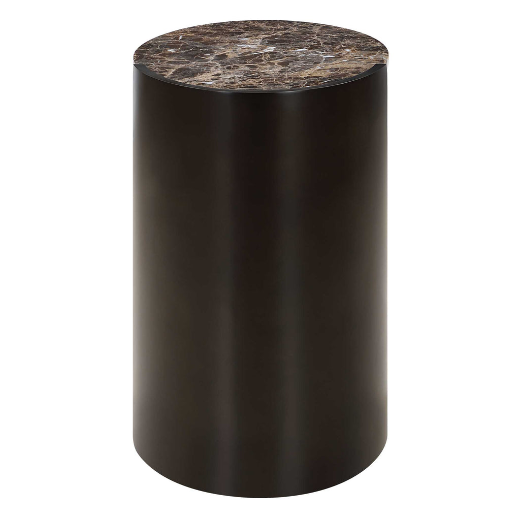 This Side Table Features A Sleek Black Metal Base With A Distinctive Sculptural Form That Enhances Both Visual Interest And Stability. The Tabletop Is Crafted From Chocolate Brown Marble, Adorned With Subtle Neutral Veining That Adds An Elegant Touch. Due To The Nature Of Marble, Each Piece Will Have Unique Coloration And Veining Pattern.
