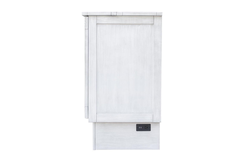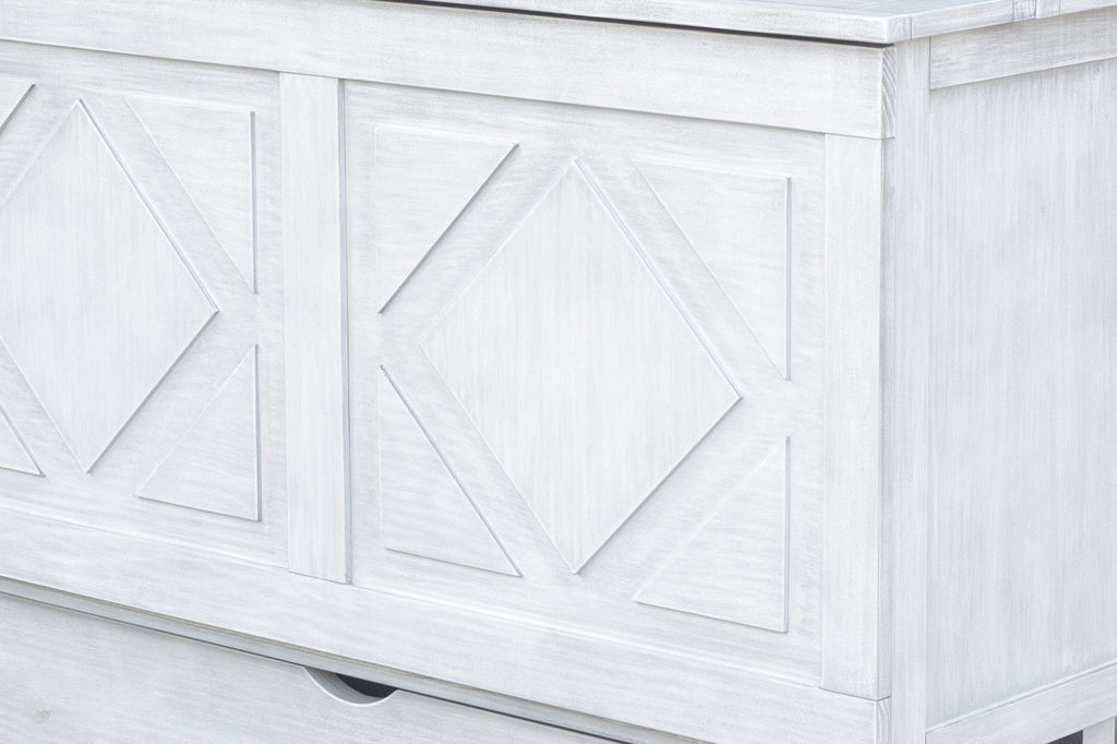 The Gramercy Sleep Cabinet brings versatility to any room in your home! Quality-built for function and style, this sleep cabinet enhances your bedroom or guest room with its distressed white finish. The cabinet front has a recessed diamond motif adding to its unique look. A convenient cut-out handle allows for easy pull-out of the queen size mattress.