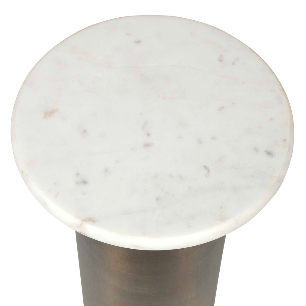 This Striking Contemporary Drink Table Presents An Elegant Interplay Of Materials, Where A Sleek Antique Brass Aluminum Base Provides A Warm Counterpoint To The Cool Sophistication Of A Naturally Veined White Marble Top. True To The Nature Of Natural Materials, Each Piece Will Have Unique Marbling And Veining Throughout.