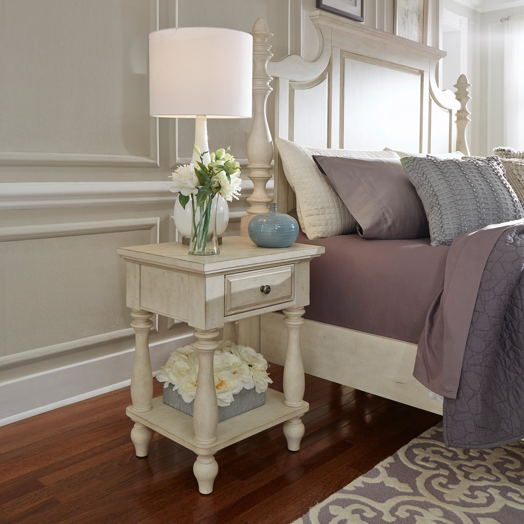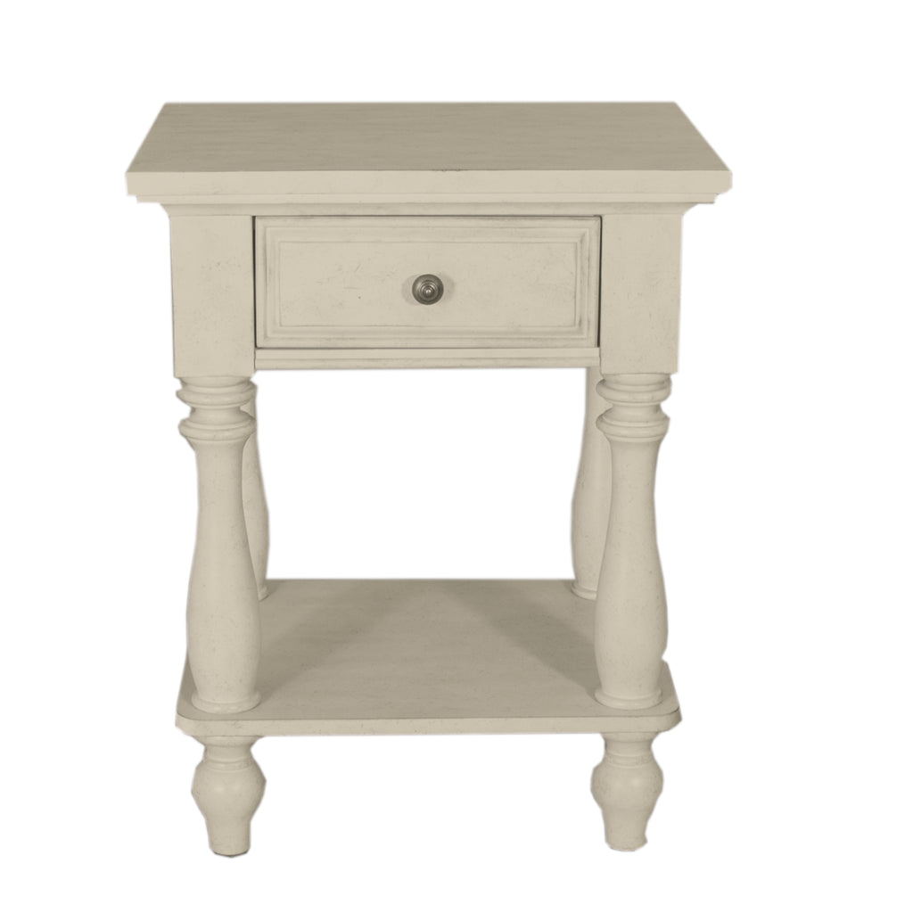 Enhance any room with this charming High Country single drawer night stand, creating a casual country interior that all homeowners love. Crafted with pine solids and knotty pine veneers, this night stand is sure to stand out with its unique antique white finish and turned legs. This piece features felt lined top drawers, bottom case dust proofing, accented by pewter knob hardware. Maximize storage with the convenient bottom shelf, perfect for storing your everyday items.