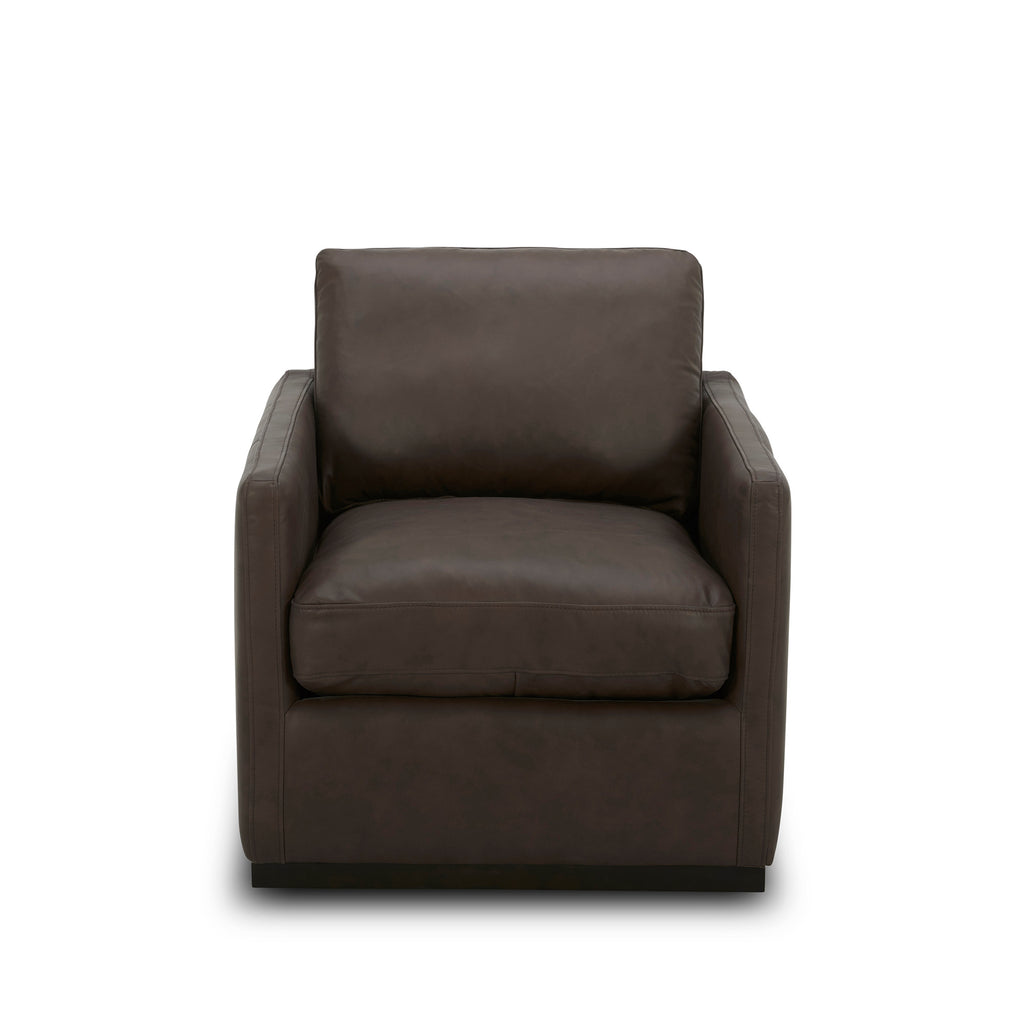 Luxury. Redefined. The Weston leather swivel accent chair features a swivel base, slim track arms with detail stitching, and removable seat and back cushions for easy cleaning. The leather match material in Timber is soft and durable. The Weston leather swivel accent chair will never go out of style and is sure to last with its protective finish that provides color consistency and durability.